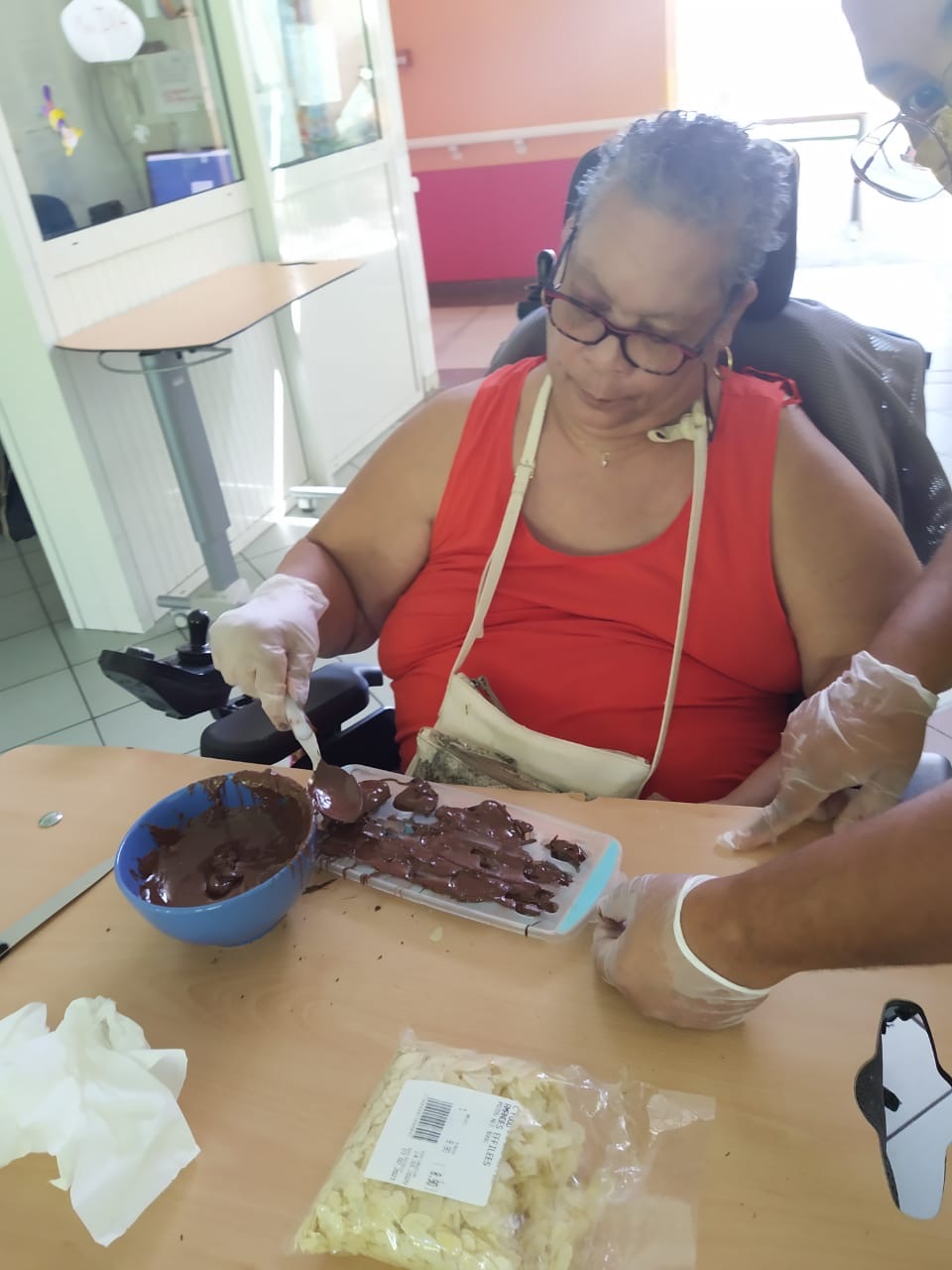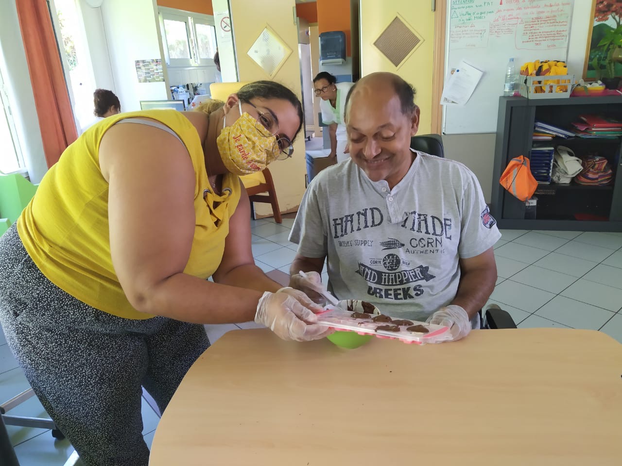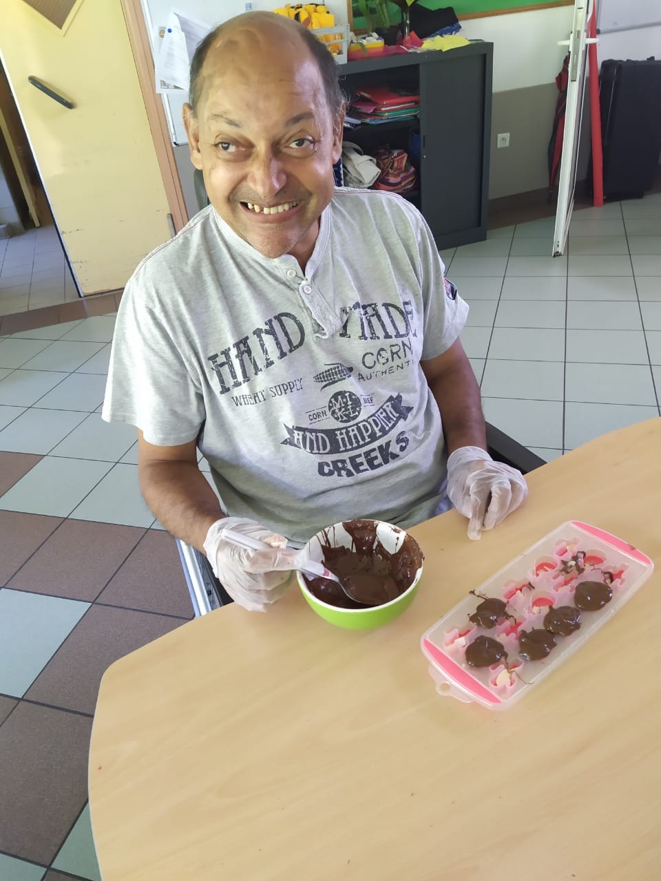 Mme Iva : « Je vis mal ce virus, car je peux plus sortir de la maison, j’ai peur mais les activités avec vous me rassurent ». « Je suis contente de faire des chocolats pour donner à ceux qui s’occupent de nous c’est important ».